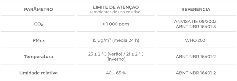 Valores acima indicam ventilação insuficiente, filtragem ineficaz ou fontes de poluentes internas.