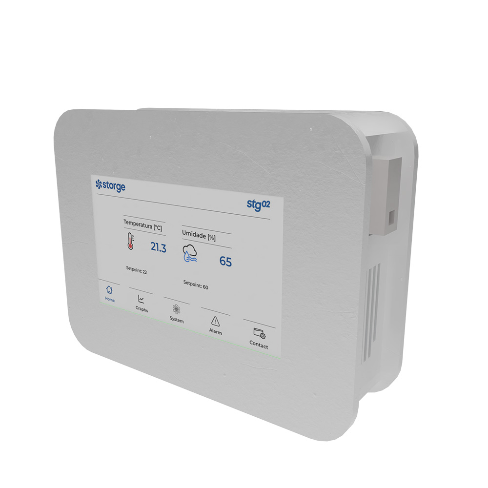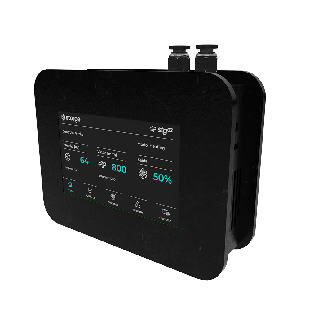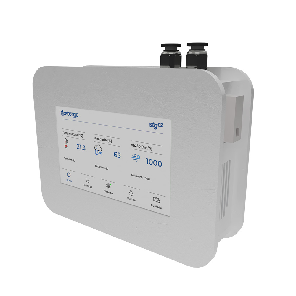 Compacto e versátil, o stgMINI centraliza a leitura de temperatura, umidade e qualidade do ar (CO/CO₂), fornecendo dados precisos para todo o sistema.